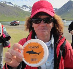 Verkostung von Hakarl – früher die Krönung eines winterlichen Festmahls. Riecht wie der schlimmste aller Käse und wird mit Brennevin, Marke „Schwarzer Tod“ hinuntergespült.
