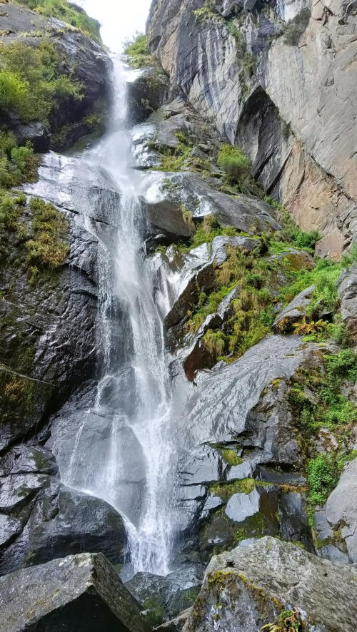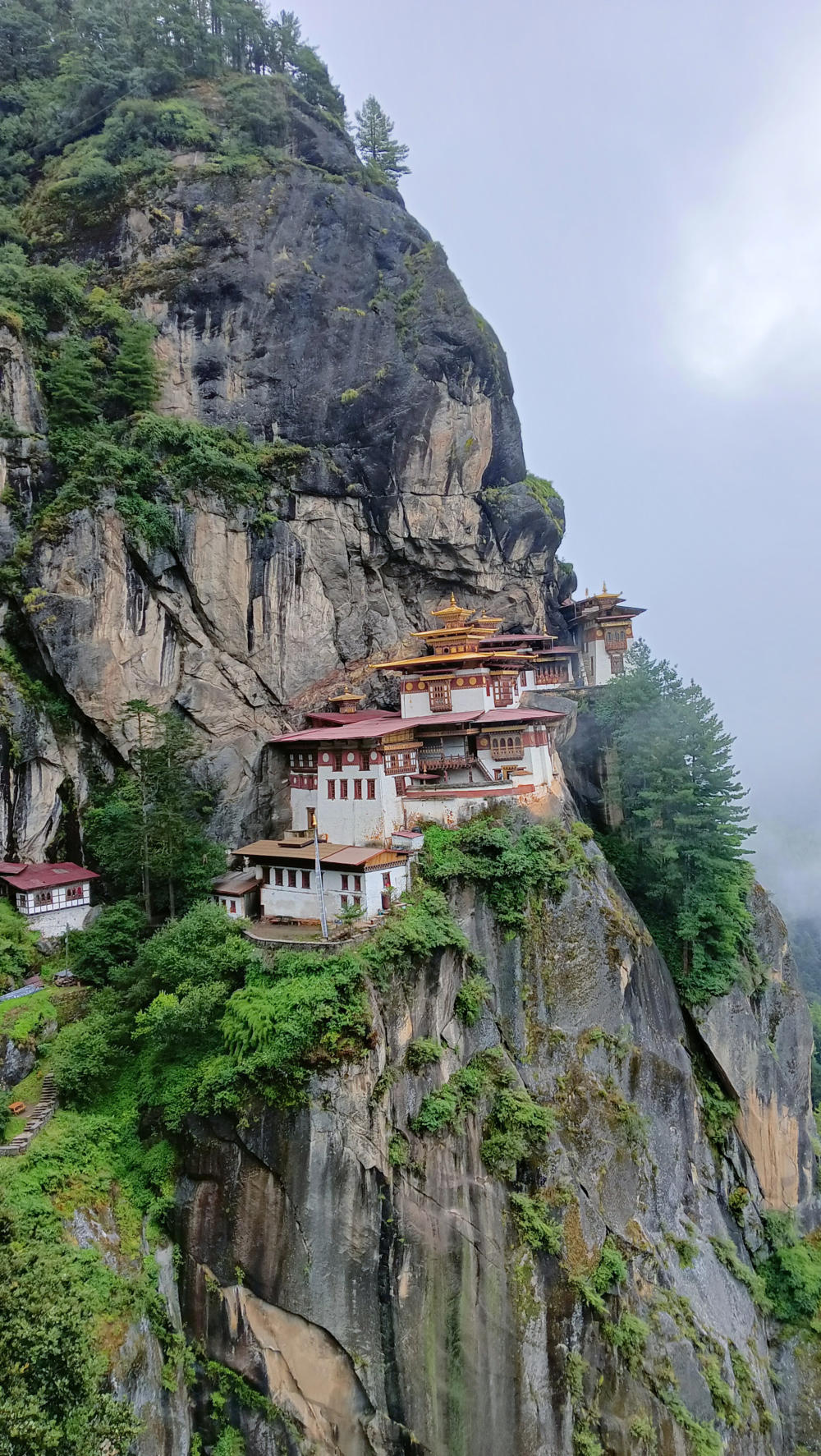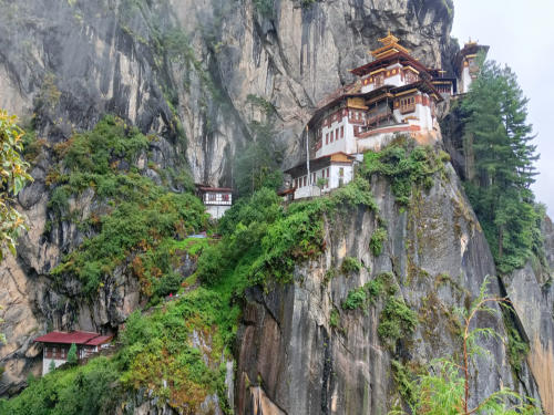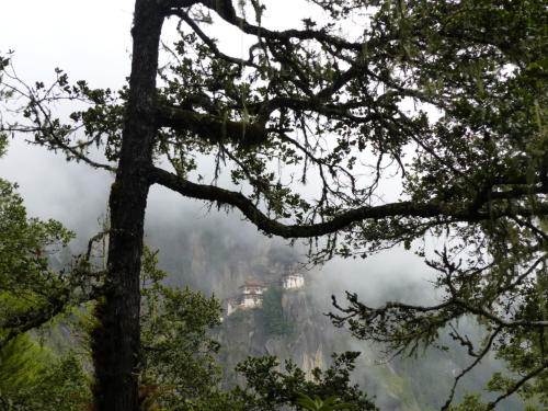 Zweifellos der Höhepunkt der Reise ist die Wanderung zum Kloster Taktshang, welches auf ca. 3150 m üNN steht. Die Klosteranlage besteht aus vier Haupttempeln und mehreren Wohngebäuden, die sich eng an die Felswände anlehnen.Ein schweißtreibender Aufstieg begann auf ca. 2600 m üNN. Nach einer Stunde erreichen wir einen Aussichtspunkt mit Cafeteria, zu sehen war im Nebel noch nichts. Kurz danach tauchte dann das Ziel aus dem Nebel auf. Vom dann etwas später folgenden Aussichtspunkt bietet sich ein wunderschönem Blick auf den für die Bhutaner heiligsten Ort.