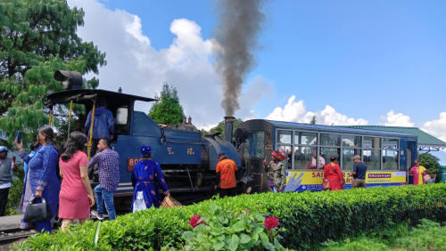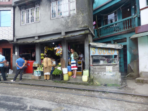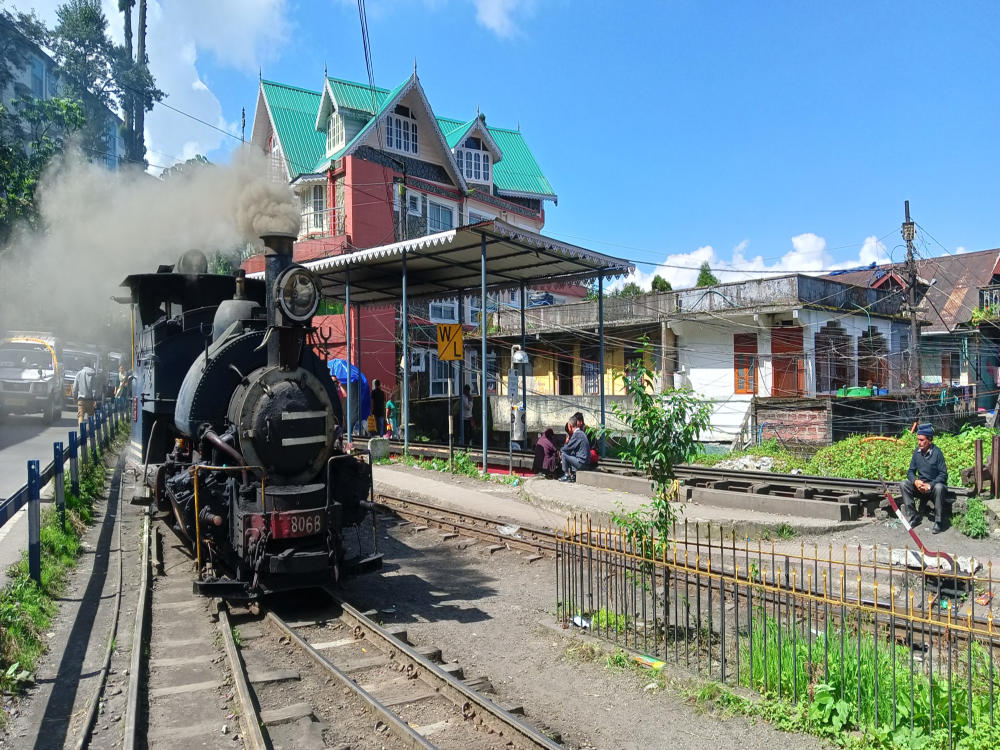 Zunächst stand eine Fahrt mit dem Toi Train von Darjeeling nach Ghum auf dem Programm. Die Darjeeling Himalayan Railway ist eine Schmalspurbahn (610mm Spurweite), die auf 86 km Strecke vom Eisenbahnknoten Jalpaiguri nach Darjeeling über 2000 Höhenmeter überwindet. Sie verläuft fast meist am Straßenrand der Serpentinenstraße, die wir am Vortag schon mit dem PKW absolviert hatten. Unsere Strecke war nur 6 km lang, aber unsere Lok musste fast durchgehend laut hupend 181 Höhenmeter zum höchstgelegenden Bahnhof Ghum (2257,7 m ü. NN) zurücklegen.