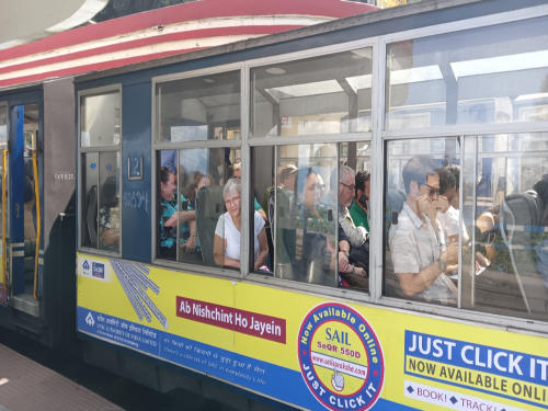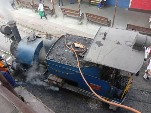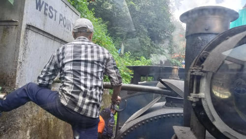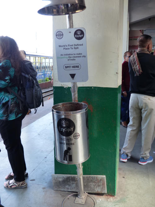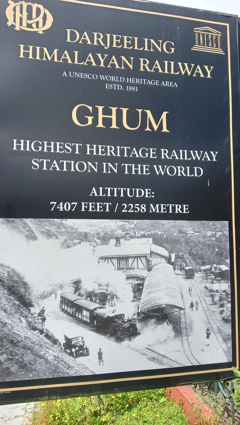 Zunächst stand eine Fahrt mit dem Toi Trainvon Darjeeling nach Ghum auf dem Programm. Die Darjeeling Himalayan Railway ist eine Schmalspurbahn (610mm Spurweite), die auf 86 km Strecke vom Eisenbahnknoten Jalpaiguri nach Darjeeling über 2000 Höhenmeter überwindet. Sie verläuft fast meist am Straßenrand der Serpentinenstraße, die wir am Vortag schon mit dem PKW absolviert hatten. Unsere Strecke war nur 6 km lang, aber unsere Lok musste fast durchgehend laut hupend 181 Höhenmeter zum höchstgelegenden Bahnhof Ghum (2257,7 m ü. NN) zurücklegen.