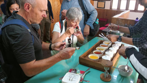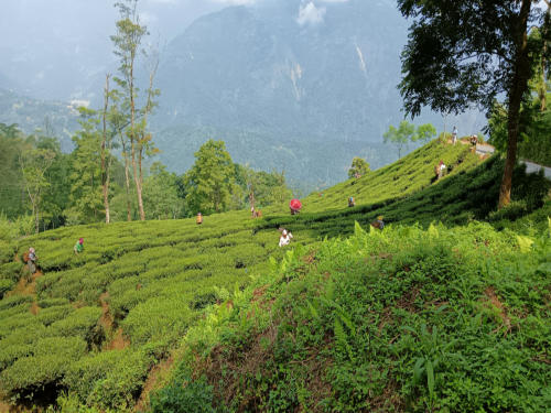 Einen ersten Kontakt zum Buddhismus bekamen wir im 1875 gebauten Kloster Ghoom. Die Engländer brachten um 1860 den Teeanbau nach Darjeeling, der sich zu einer weltweit bekannten Marke entwickelte. Heute leben ca. 70.000 Menschen hier vom Teeanbau