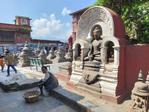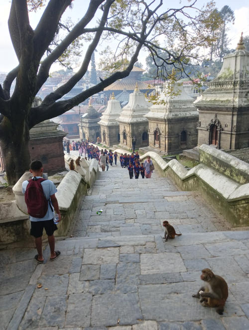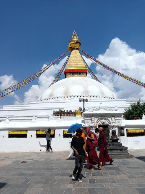 Aus dem ruhigen, besinnlichen und angenehm temperierten Bhutan hinein in das laute quirlige Leben der Millionenmetropole Kathmandu.Zunächst stand ein Besuch der hoch über der Stadt gelegenen Tempelanlage von Swayambhunathein auf dem Programm. Zurück in der Stadt ging es zur Boudhanath, der “Großen Stupa“. eine der größten kugelförmigen Stupas der Welt.Ein Besuch der hinduistischen Pashupatinath-Tempelanlage. Die riesige Anlage erstreckt sich auf einer Fläche von 246 Hektar entlang des Ufers des heiligen Bagmati-Flusses und umfasst 518 Tempel.Nichts für Europäer, Tote werden in Nepal öffentlich verbrannt.Ein ganzer Tag ist zu wenig, um die alte Königsstadt Bhaktapur zu erkunden. Altertümlich gepflasterten Straßen und Gassen, viele prachtvollen Tempel und Paläste mit herausragender Baukunst sind zu bestaunen. Alle traditionellen Handwerke sind ebenso vertreten wie der Handel mit allen nur denkbaren Waren. Daneben trifft man auf Schritt und Tritt auf eine traditionelle, aber sehr lebendige Musikszene .Leider war die Reise schon wieder zu Ende. Wie schon am Anfang beschrieben, gab es große Kontraste im Klima, den Landschaften, dem Leben. „Kulturschock“ Indien, das ruhige, beschauliche Bhutan und zum Schluss wieder etwas „Chaos“ und quirliges Leben in Nepal. Sicher passt nicht alles in unser Eurozentristisches Weltbild was wir so gesehen haben, aber wenn man diese „Brille“ absetzt, war es eine tolle Reise, die uns neben den schönen Landschaften doch einiges über die Geschichte, die Kultur der besuchten Länder und deren Menschen nahe gebracht hat.